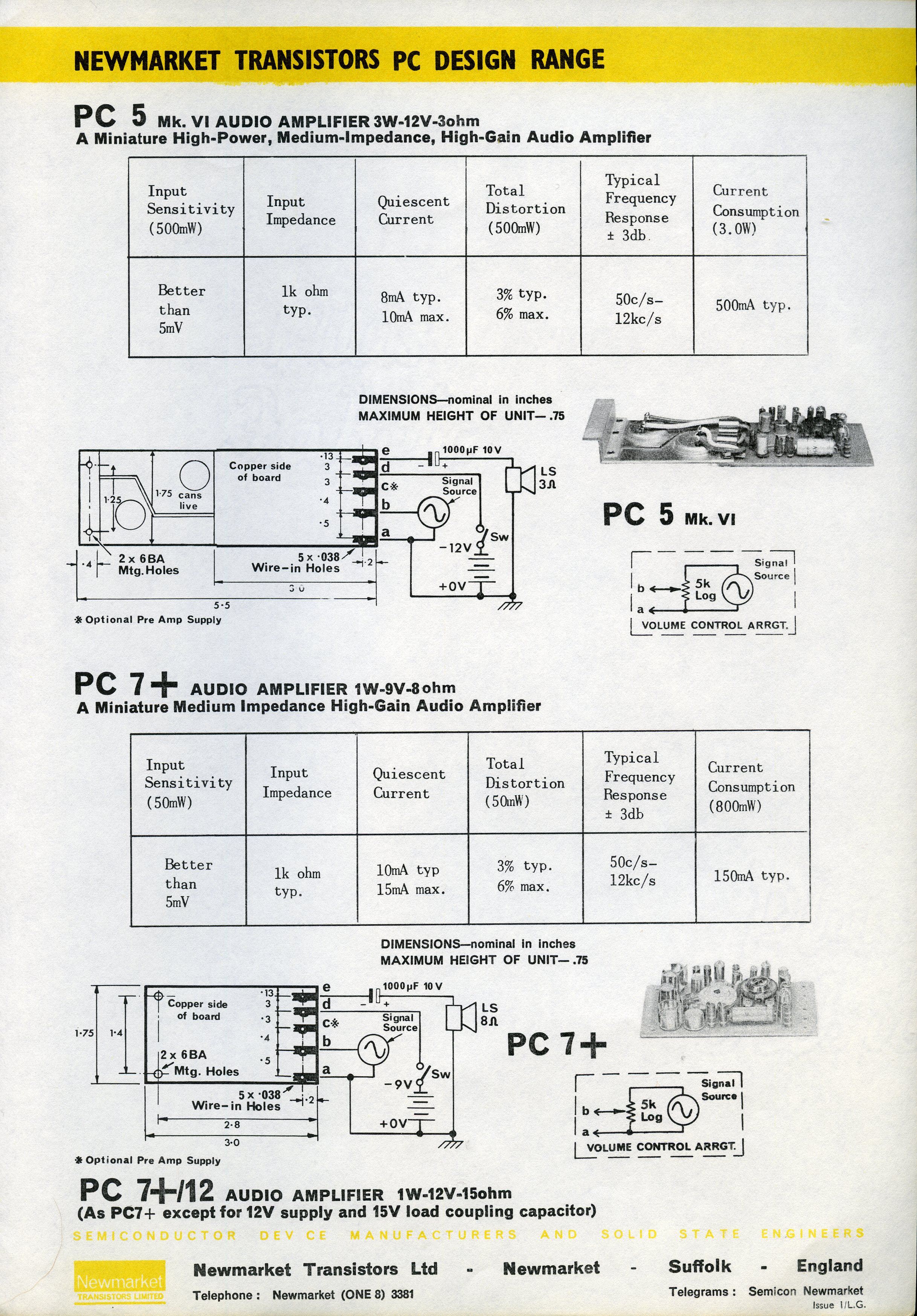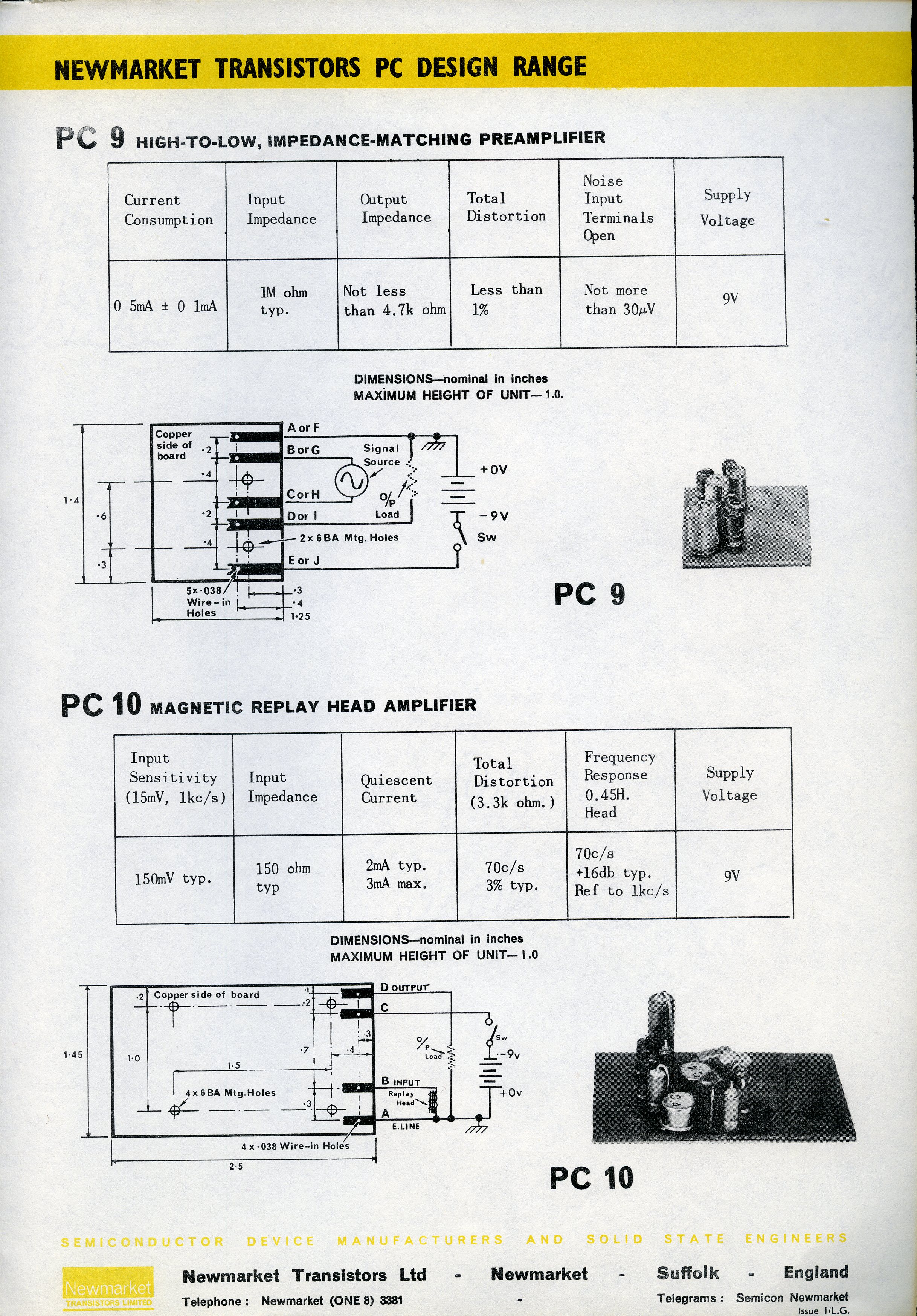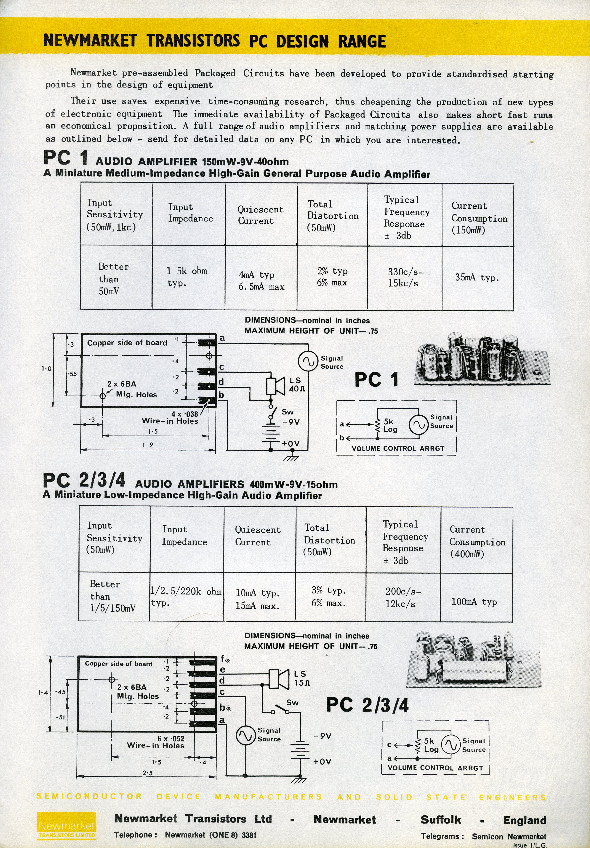 This page is about the smallish circuit boards containing germanium transistors that were sold by Newmarket Transistors Ltd in the 1960s and 70s. These are described in their Product Portfolio from 1962.