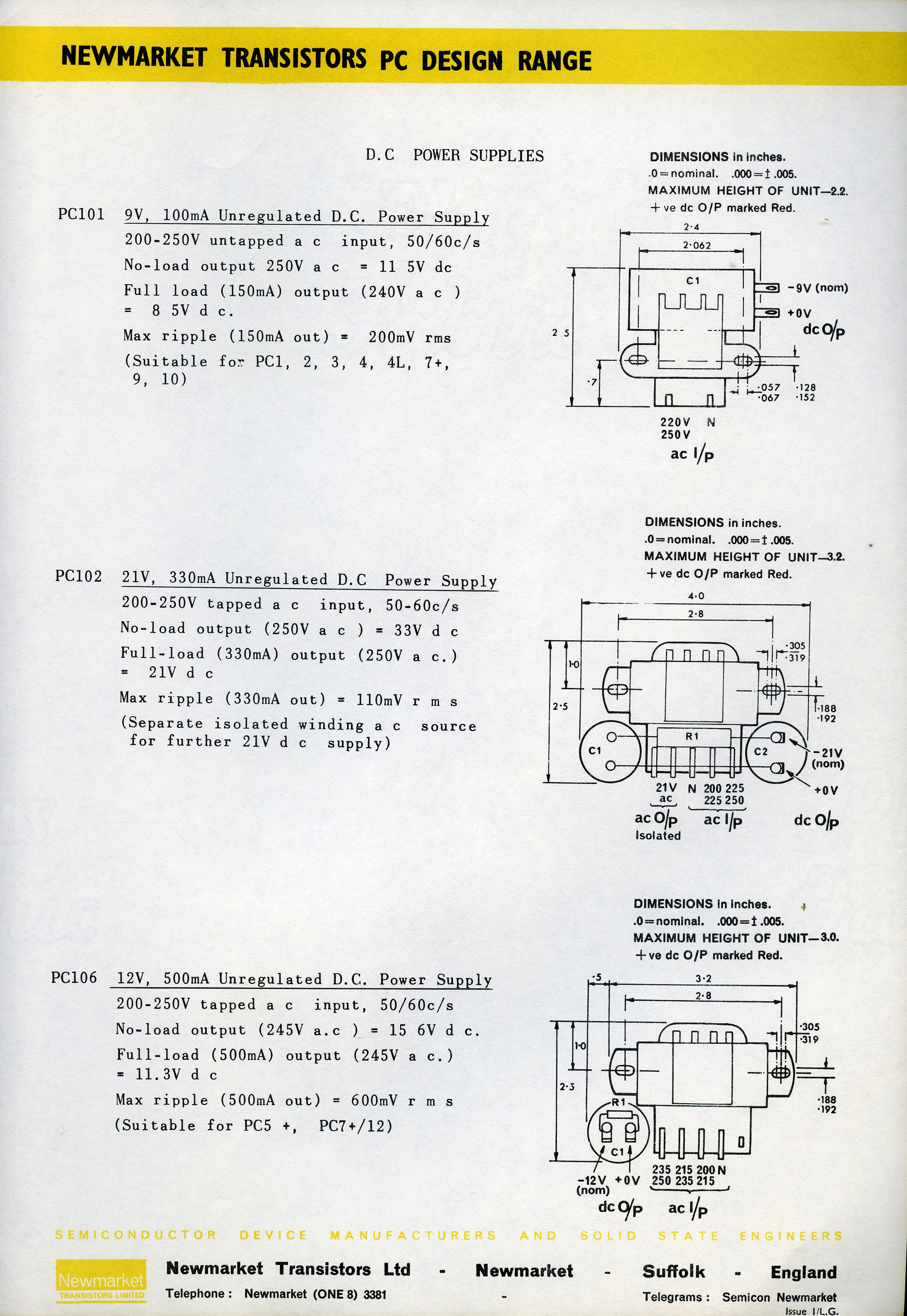 PC101 is an 9V 100mA unregulated power supply, PC102 is a 22V 330mA unregulated power supply, and PC106 is a 12V 500mA unregulated power supply. These are all just transformers with an apparently-unmarked metal rectifier (Newmarket did not make diodes) and one or two smoothing capacitors. I don't think there are any Newmarket components in these, the company just sold them to complement the PC cards. I don't have any of them.